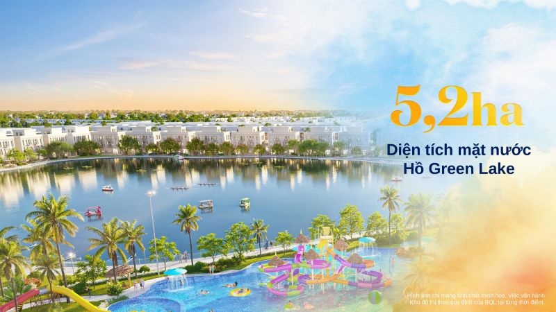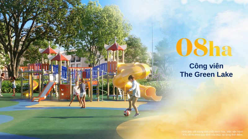 Công viên giải trí trung tâm The Green Lake rộng 8ha: “Lá phổi” điều hòa không khí được ví như “điều hòa tự nhiên” với công nghệ xử lý nước hiện đại tương tự các hồ nhân tạo nổi tiếng tại Vinhomes Ocean Park, Vinhomes Grand Park hay Vinhomes Smart City, đảm bảo mặt nước luôn trong xanh và an toàn cho mọi hoạt động ven hồ.